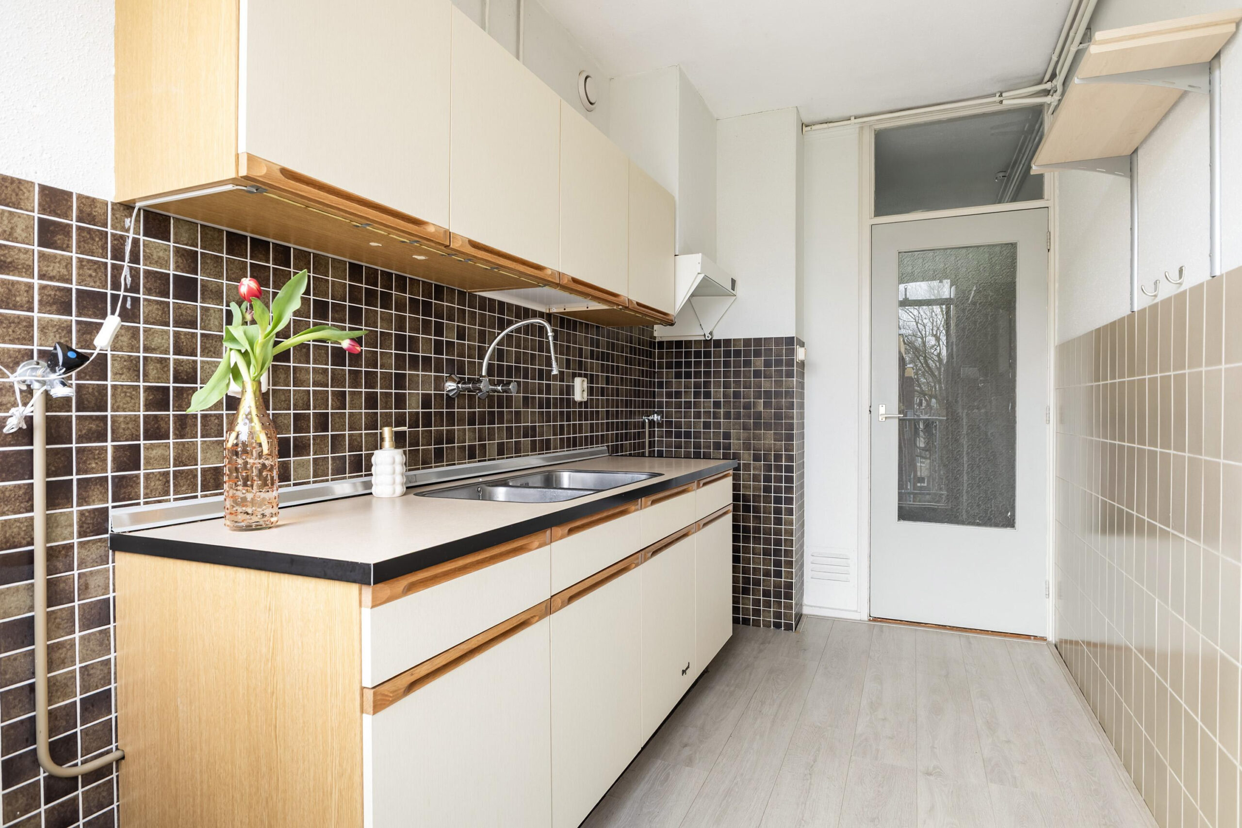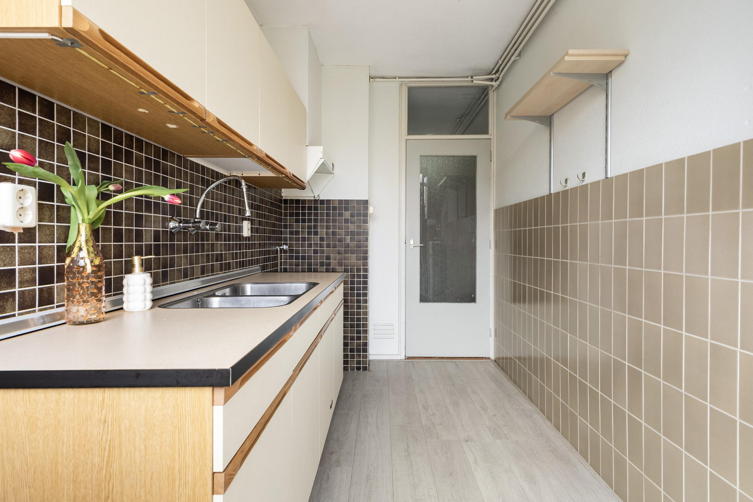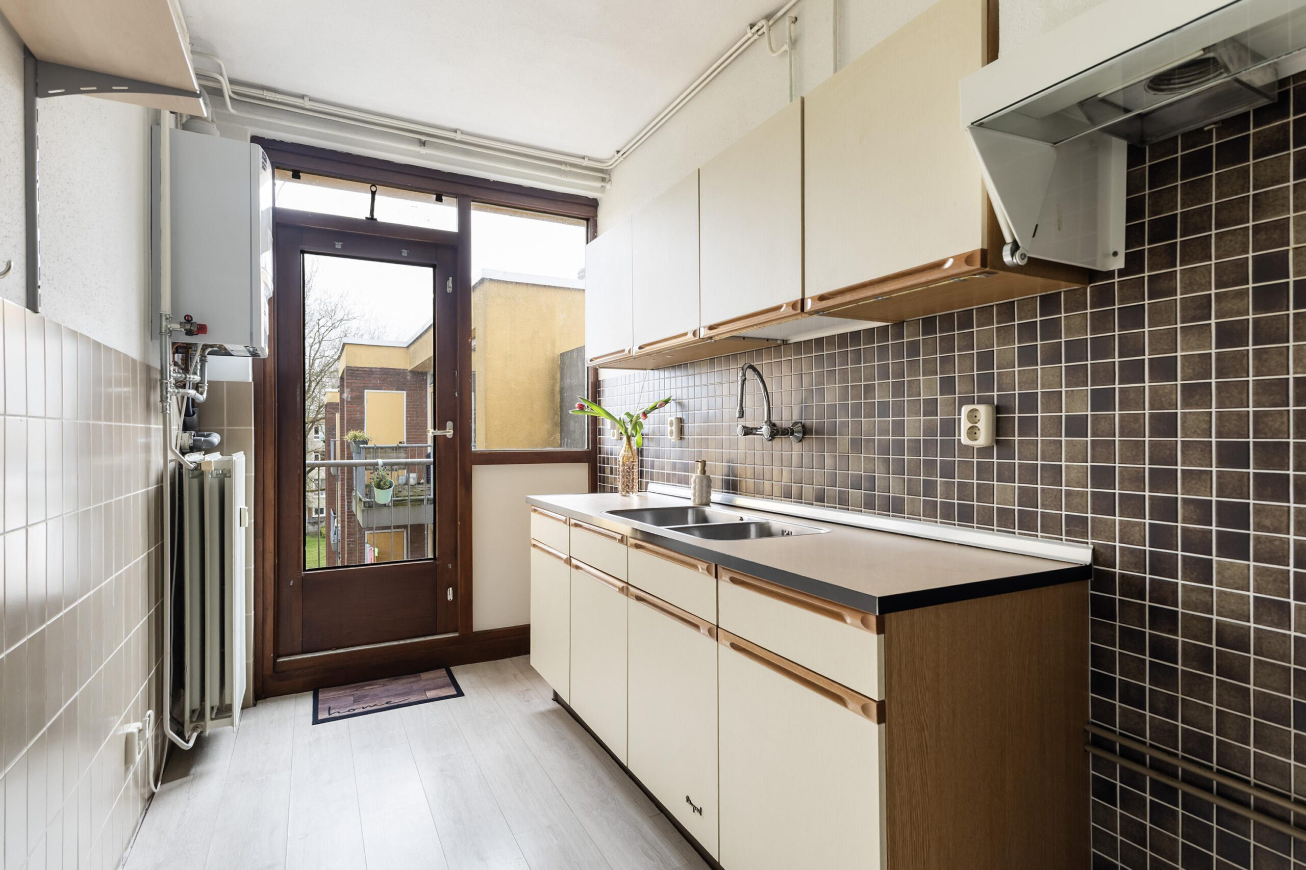 - Keuken met wasmachine opstelling en toegang naar balkon (op het oosten);